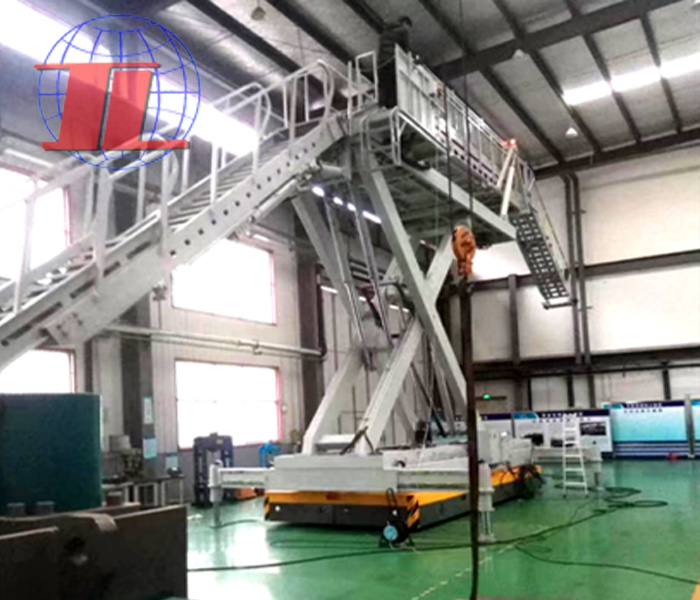 When it is necessary to use the boarding platform, the operator starts the hydraulic pump, which draws hydraulic oil from the oil tank and pressurizes it, and delivers high-pressure oil to the hydraulic cylinder through the hydraulic pipeline. The piston inside the hydraulic cylinder generates thrust under the action of high-pressure oil, pushing the scissor arm to gradually expand and raise the platform to a height level with the ship deck. The operator adjusts the flow rate and pressure of hydraulic oil by controlling the hydraulic valve, and controls the lifting speed and height of the platform. During the process of platform ascent or descent, sensors monitor real-time parameters such as platform height and load capacity, and provide feedback to the control system to ensure safe operation. After the platform reaches the appropriate position, it can be docked with the ship deck by moving the base, and personnel can safely board the ship through the boarding channel.